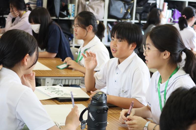 生徒たちは自分たちが作成したゲストカードを掲げてお迎えし、紫西会館にて、お互いの学校紹介や交流のレクリエーションを行いました。その後、本館に移動し、英語の授業を一緒に受けました。給食の時間も、本校生徒が配膳などのエスコートをしながら楽しく交流することができました。
